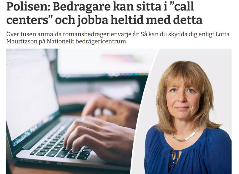 Sedan 2019 har brottskoden ”romansbedrägerier” funnits. Lotta Mauritzson jobbar med dessa och andra bedrägeribrott för polismyndigheten. Hon vet att mörkertalet för dessa brott är stort.