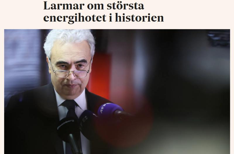 – Vi står inför det största hotet mot energisäkerheten genom tiderna, säger Fatih Birol, chef för västvärldens energiorganisation IEA, till tv-kanalen CNBC.