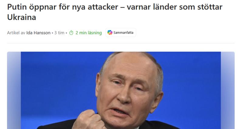 Det lyfter kriget till en ny nivå – än farligare. Många media i världen rapporterar om hur allvarlig utvecklingen är i öst. I Sverige har vi nog inte förstått vad världen kan stå inför. Vi ger här en länk som speglar hur man ser på utveckli... Putin: Rusta för krig
