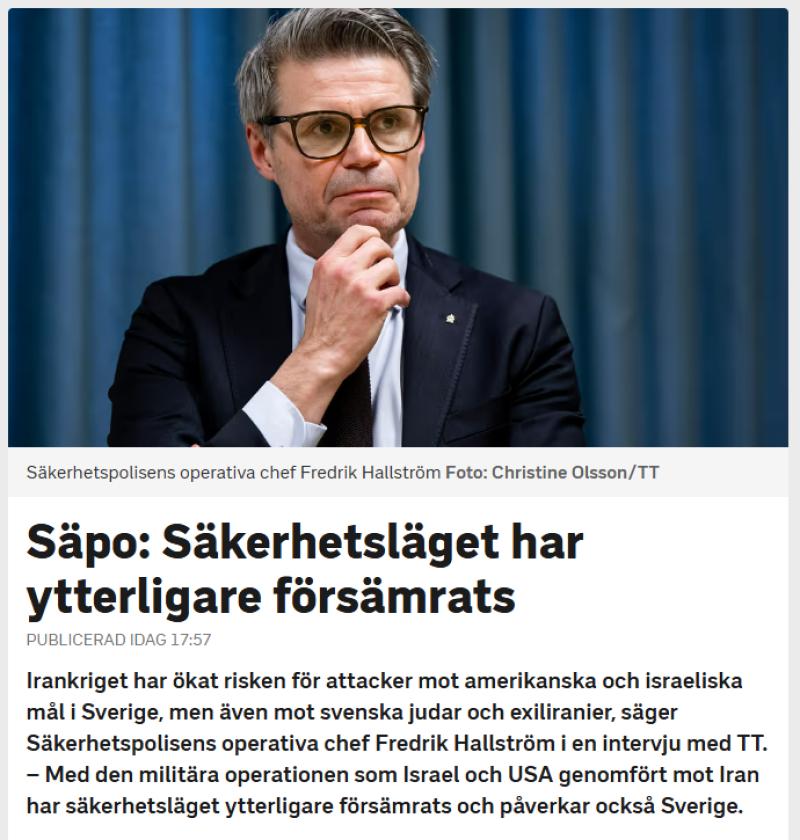 Det syns ingen nedtrappning av kriget som startade i lördags. Det är snarare en upptrappning som vi ser. Iran har många tentakler uti i Europa och världen, även i Sverige, därför kan ske attentat i vårt land. Säkerhetsrisken har ökat i Sverige, se bilden längst ner från SVT.
