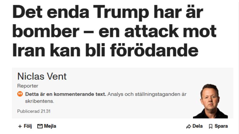För att vi skall förstå omfattningen kan detta nämnas: Ett hangarfartyg finns redan på plats och ytterligare ett, USS Gerald Ford, närmade sig Gibraltar sund på onsdagen. Det är det största örlogsfartyg som någonsin har byggts, med kapacitet att transportera 75 stridsflygplan och omgivet av en hel grupp av jagare, kryssare och andra fartyg. Men det kan också bli förödande för USA och för andra länder, se också skärmdumpningen längst ner från Aftonbladet.